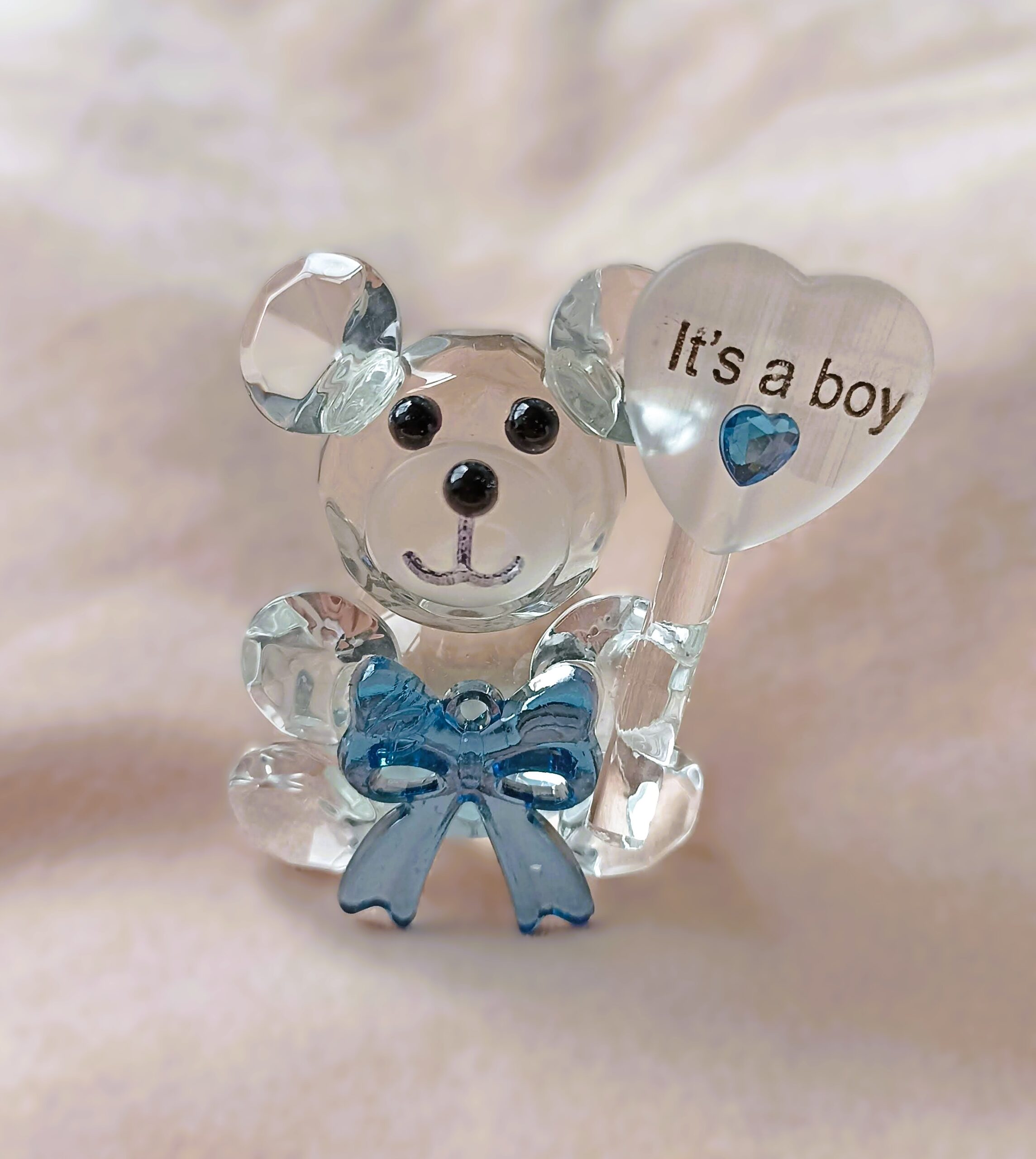 Dit prachtige kristallen beertje houdt een bordje vast met de tekst “It’s a boy” of “It’s a girl”.