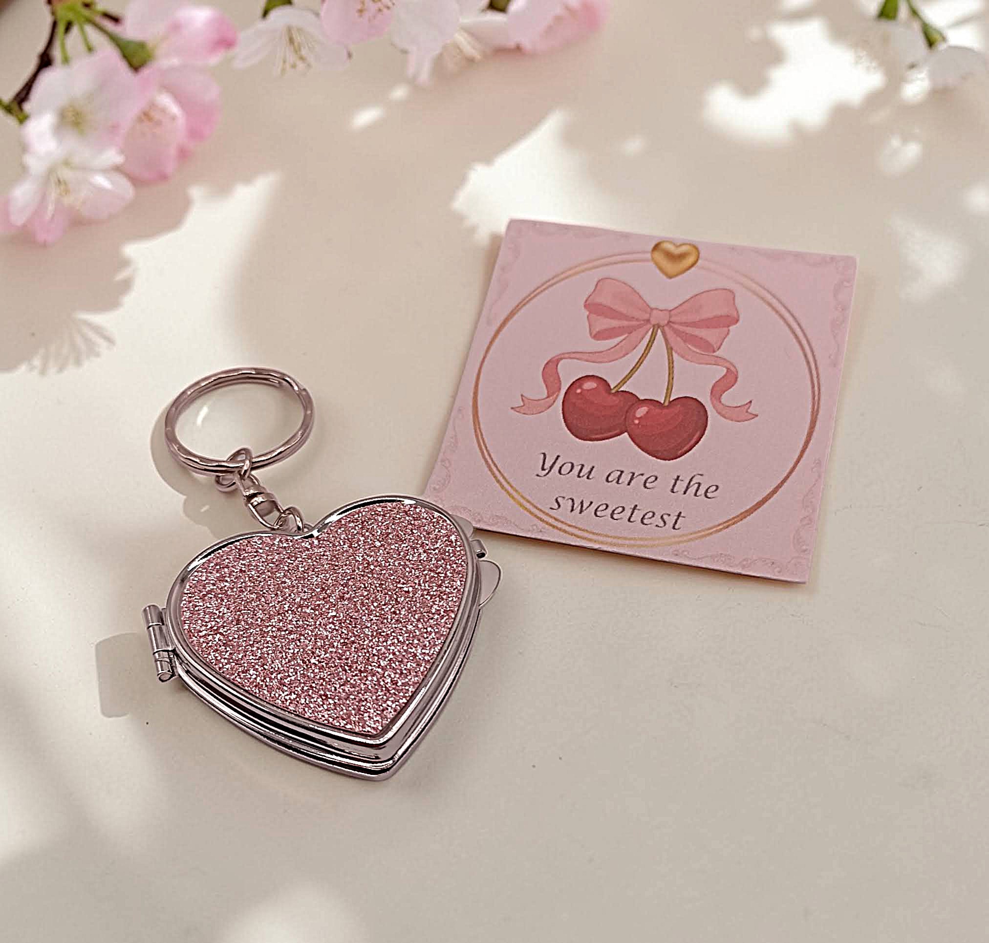 Dit mooie roze glitter hartje kun je openklappen, en heeft twee spiegeltjes aan de binnenkant.