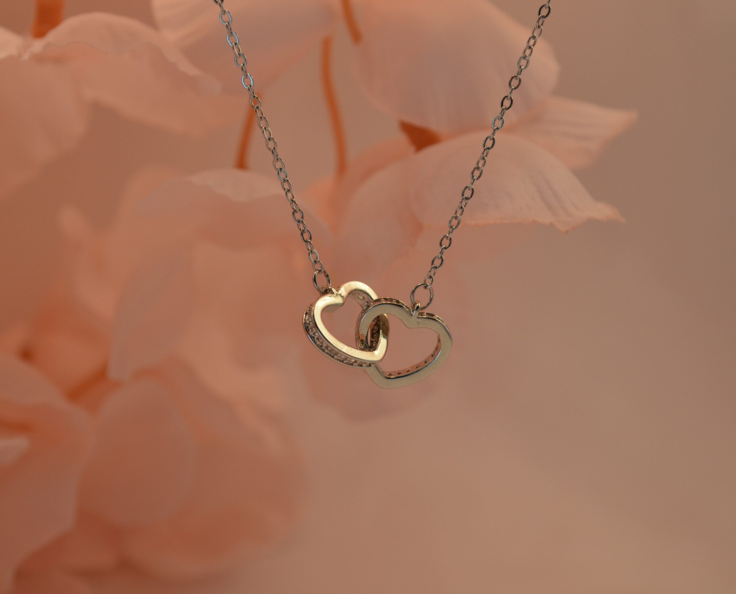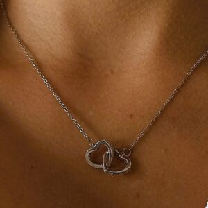 “Fijn kettinkje met twee sierlijke, in elkaar gehaakte hartjes in zilverkleurig stainless steel. Een prachtig symbool van verbondenheid en liefde. Perfect om cadeau te geven aan je geliefde, of aan iemand die je wilt laten weten hoeveel ze voor je betekent. Mooi verpakt en klaar om iemand blij te maken.”