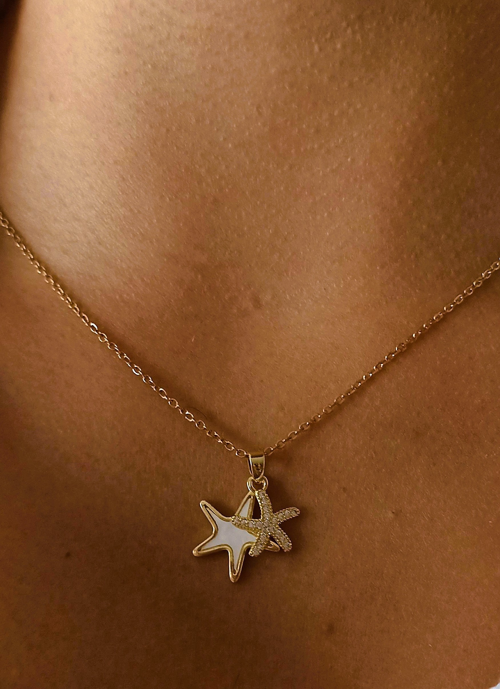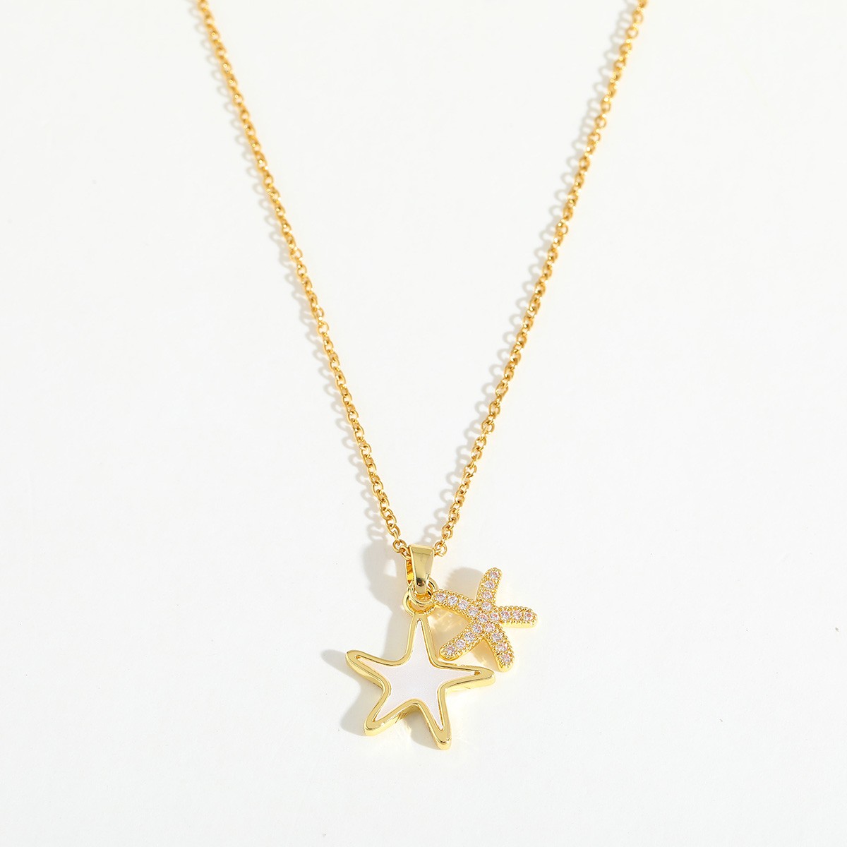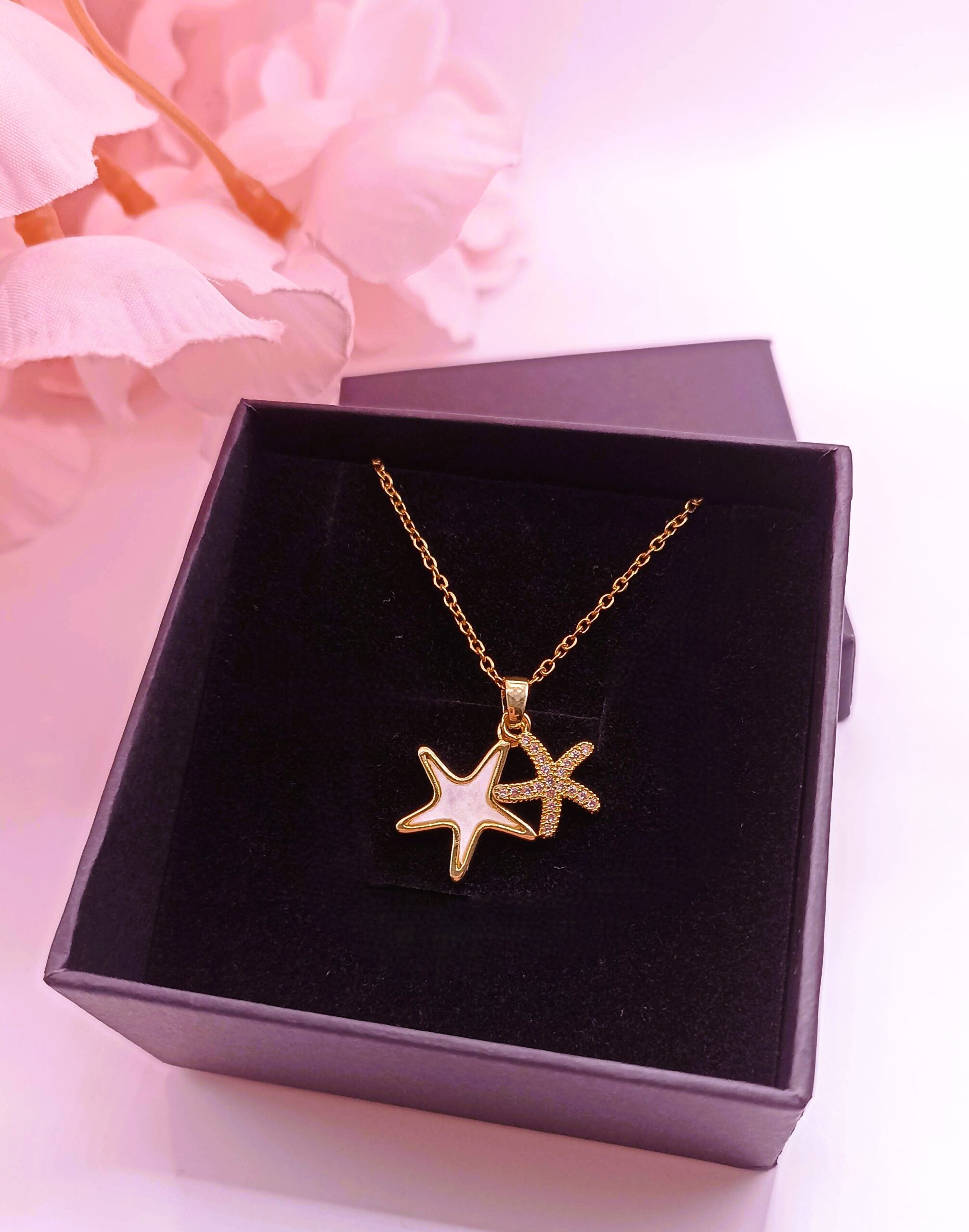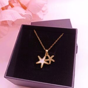 Deze moderne ketting met parelmoerster en zeester is stijlvol, trendy en een echte blikvanger.