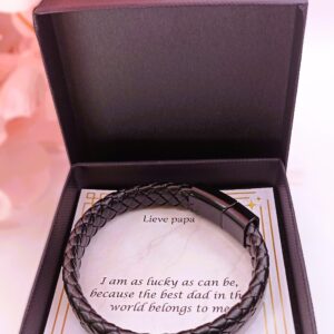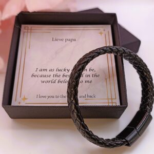 Stoere armband leatherlook, een stijlvol en persoonlijk cadeau voor je vader of zoon. Om te laten zien hoeveel hij voor je betekent en hoe bijzonder hij is. Combineer de armband met een persoonlijk cadeaukaartje voor een extra speciaal gebaar. Een originele cadeautip voor een verjaardag, Vaderdag of gewoon zomaar.”